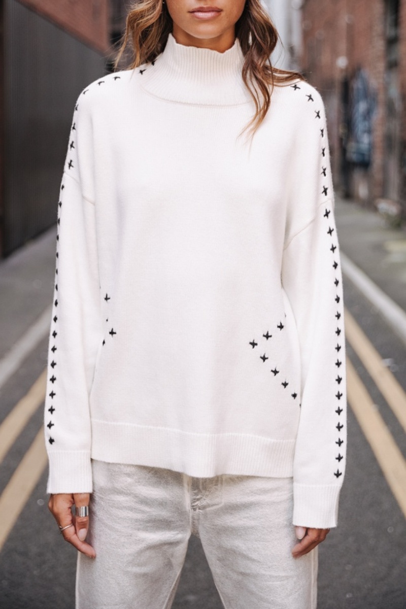 Pull long col montant dans une maille douce et chaleureuse unie avec détail de broderie sur le corps et les emmanchures.