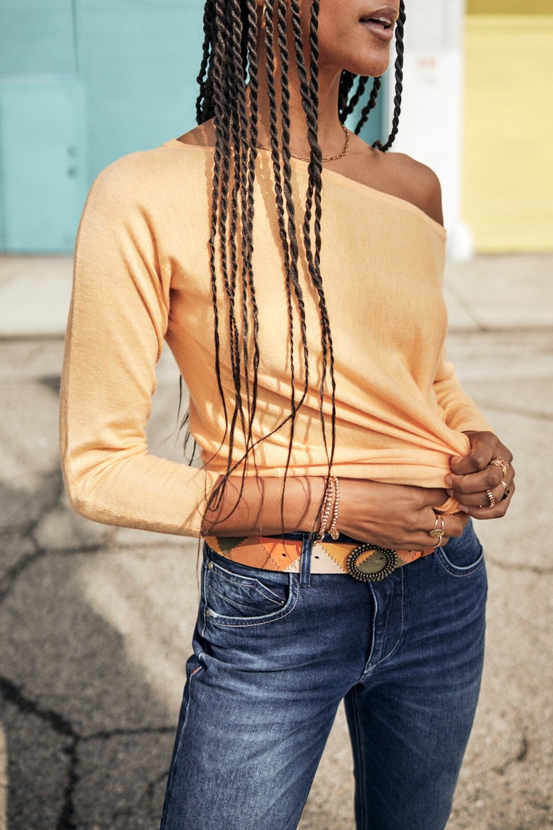 Le mannequin mesure 175 cm et porte une taille 27/S.