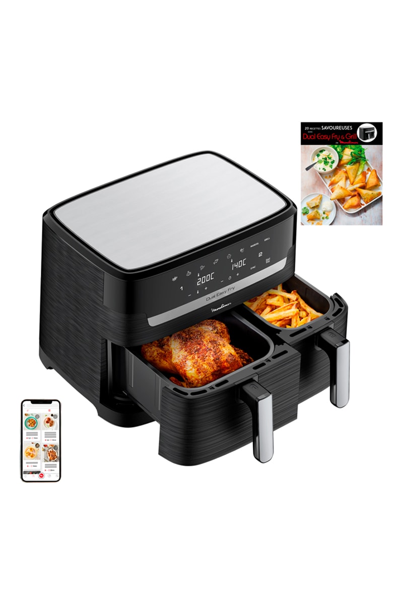 Contenu : friteuse à air Easy Fry Dual, 2 tiroirs pour cuisson à air chaud amovibles, guide de démarrage rapide, mode d'emploi, livret de 20 recettes.