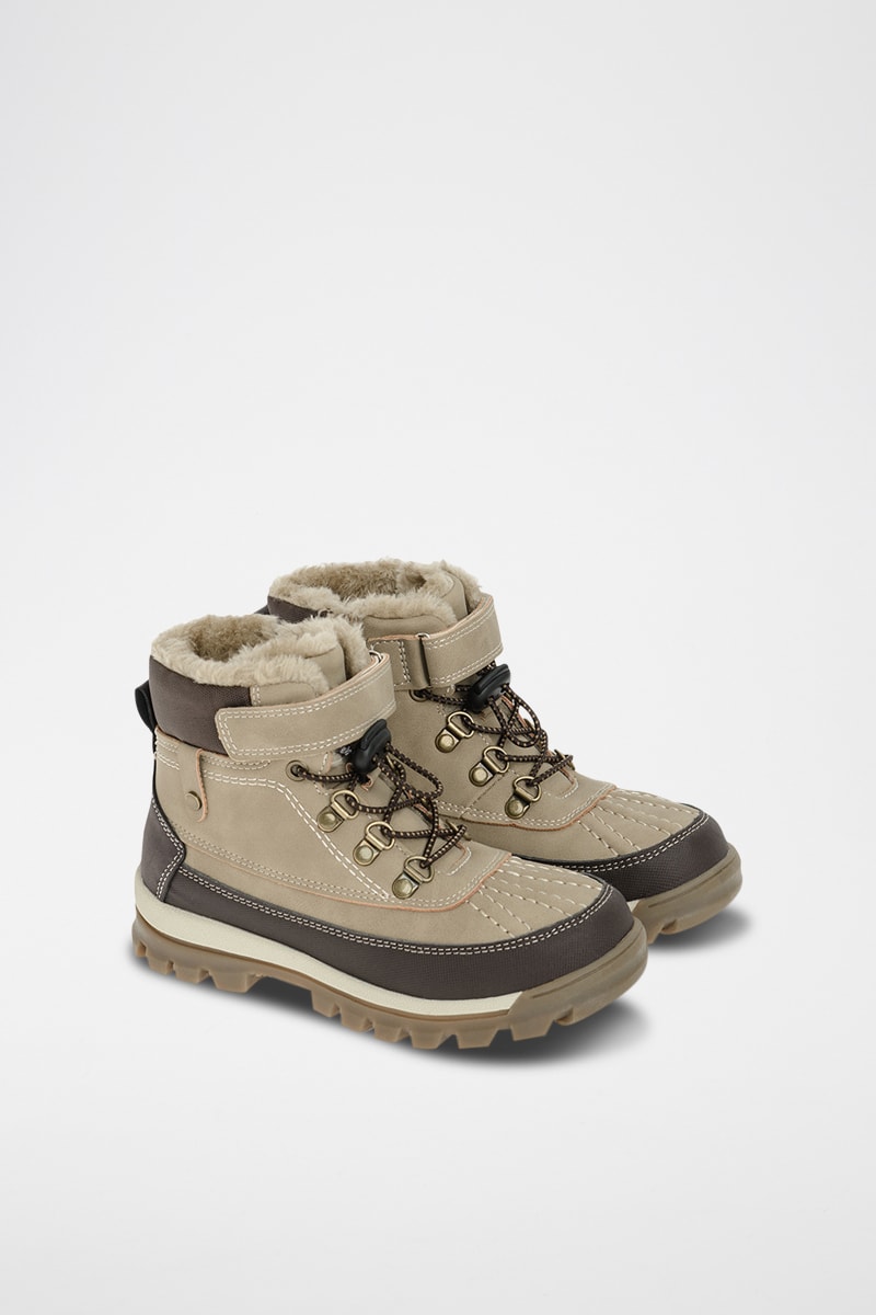 Fermeture à lacets avec barillet , par scratch devant et zippée et par scratch sur le côté.