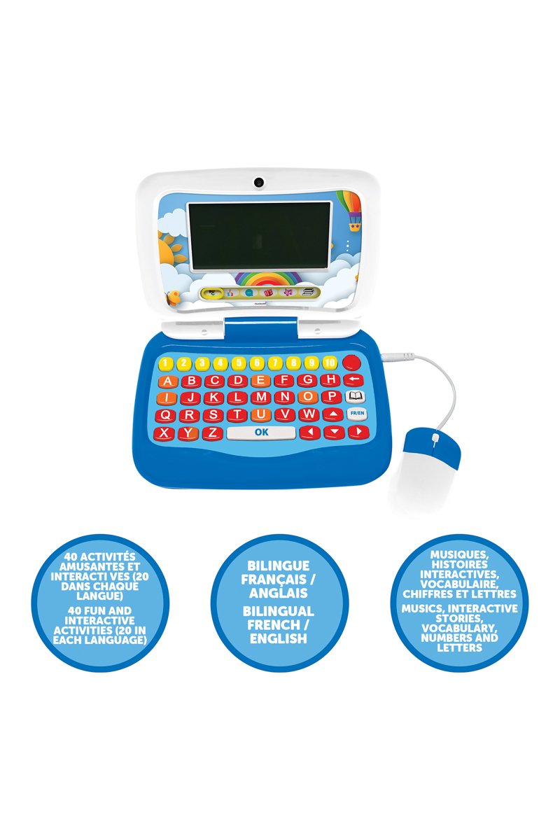 Ordinateur portable éducatif bilingue (anglais et français) avec 20 activités par langue pour guider les enfants dans leurs premiers pas à l'école.
