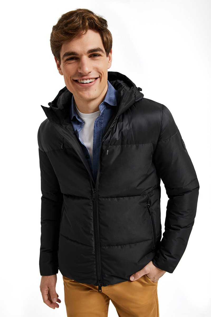 Doudoune imperméable à capuche avec liens de serrage et barillets.