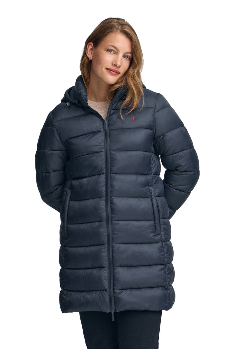 Doudoune à capuche avec liens de serrage.