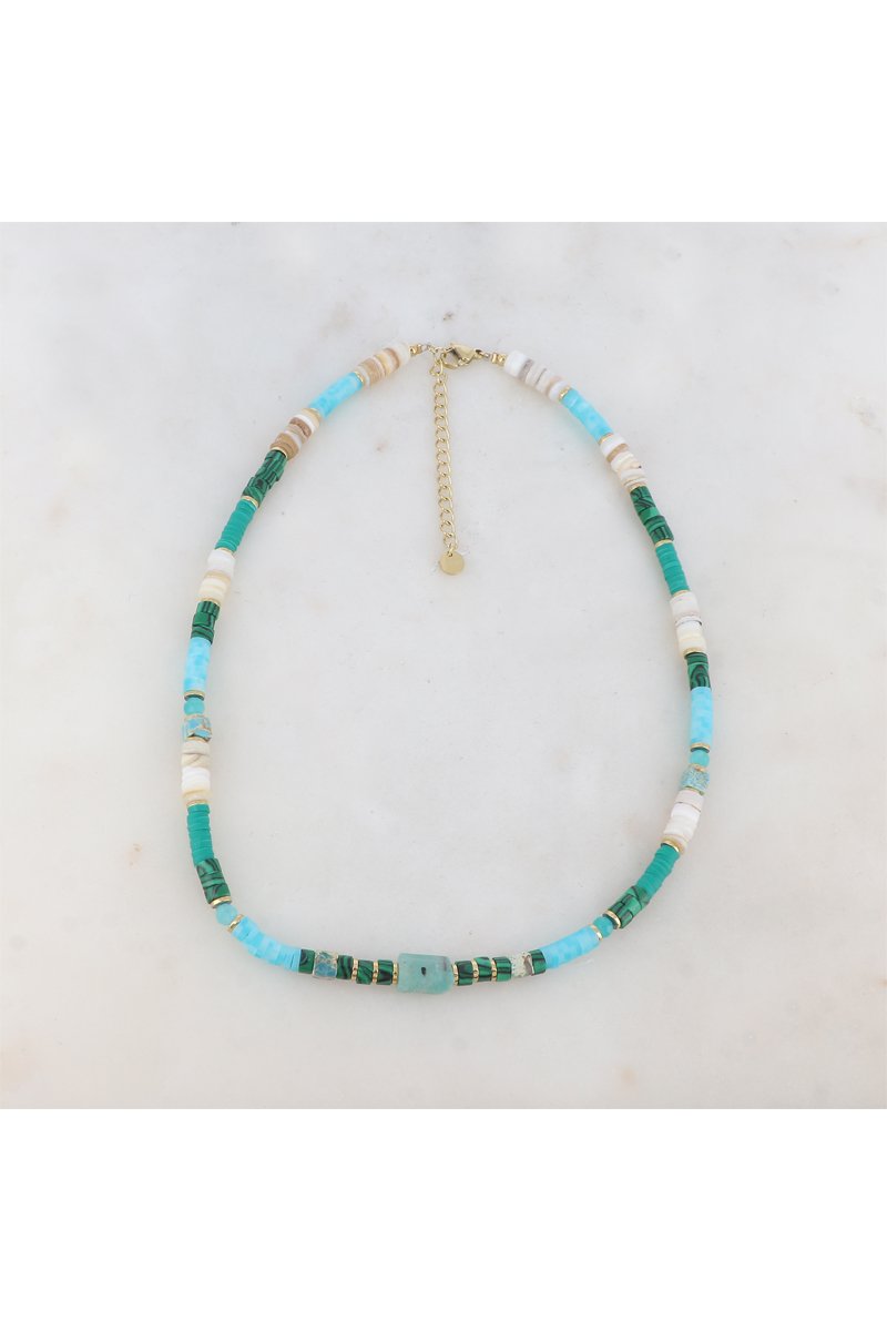 Collier serti d’agates, de coquillages et de perles Heishi.