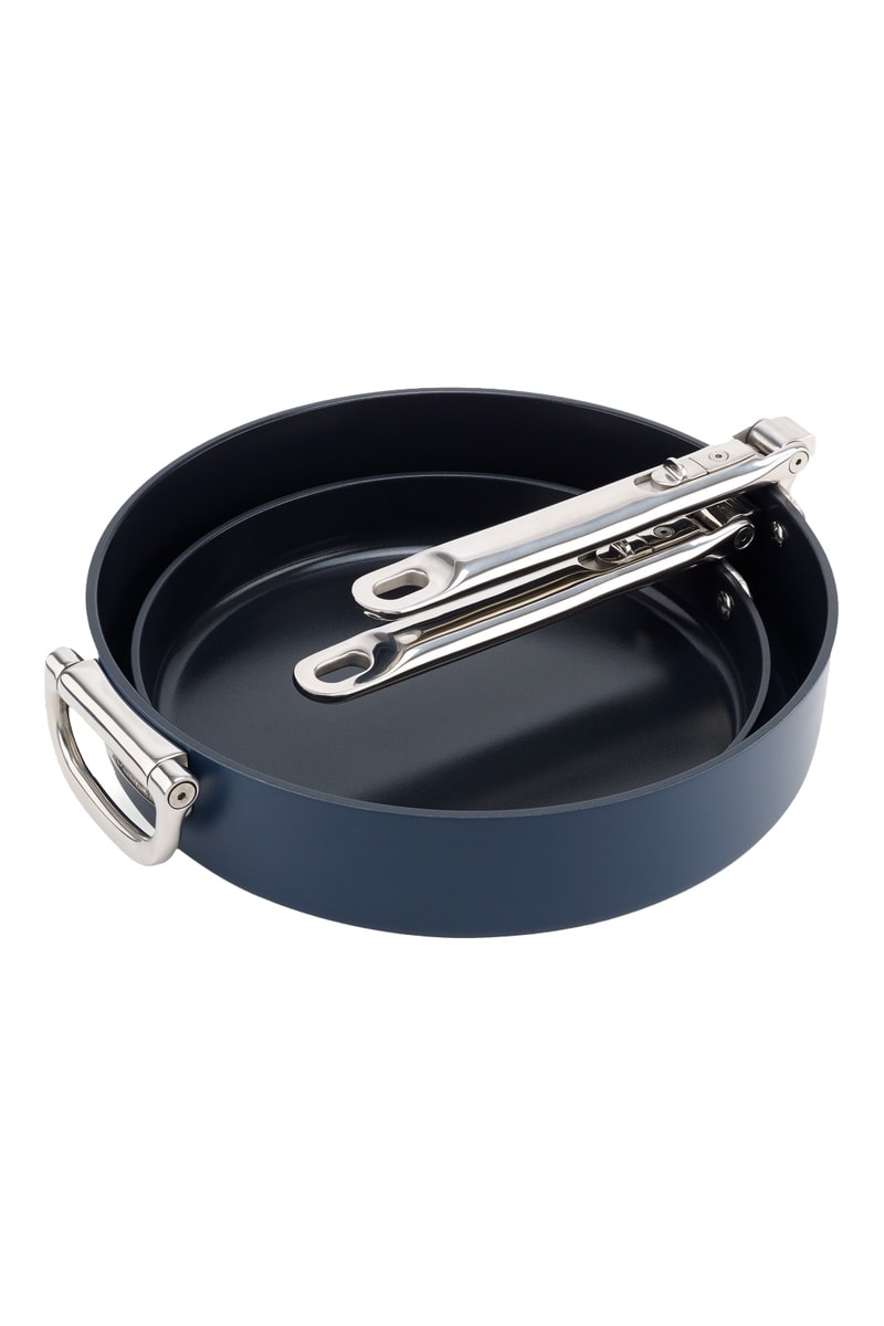 S'emboîtent parfaitement et sont dotées de poignées astucieuses pliables en acier inoxydable qui permettent d'économiser jusqu'à 50 % d'espace supplémentaire que les poêles standard lorsqu'elles sont rangées.
