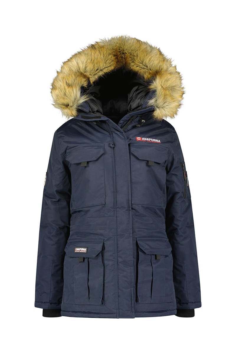 Parka à capuche avec liens de serrage, barillet, fourrure synthétique et patte réglable.