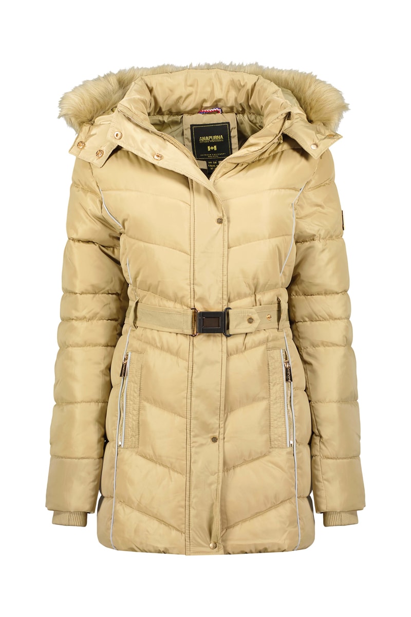 Doudoune longue à capuche amovible avec fourrure synthétique et patte pressionnée.
