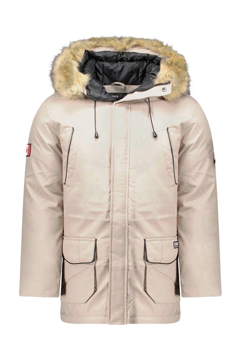 Veste à capuche avec fourrure synthétique et empiècement contrastant.