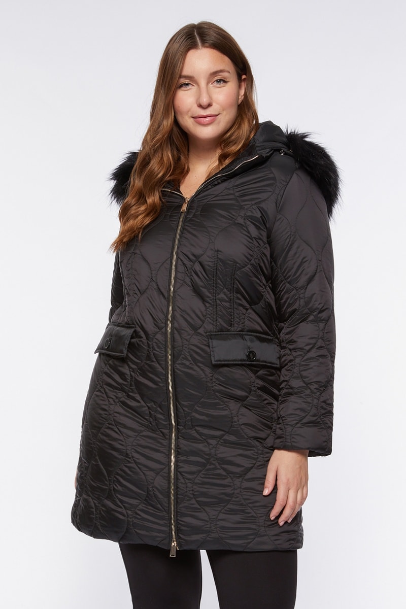Doudoune à capuche en fourrure synthétique.