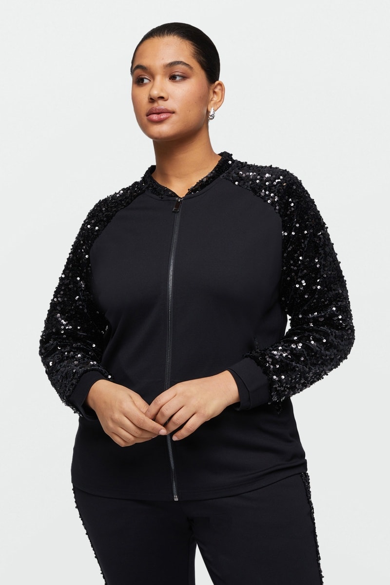 Sequins à l'encolure, sur les manches et devant.