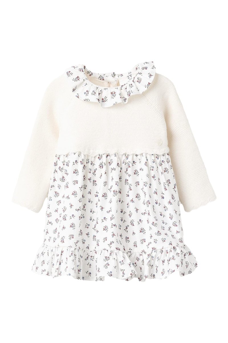 Motifs fleuris à l’encolure et sur la jupe.