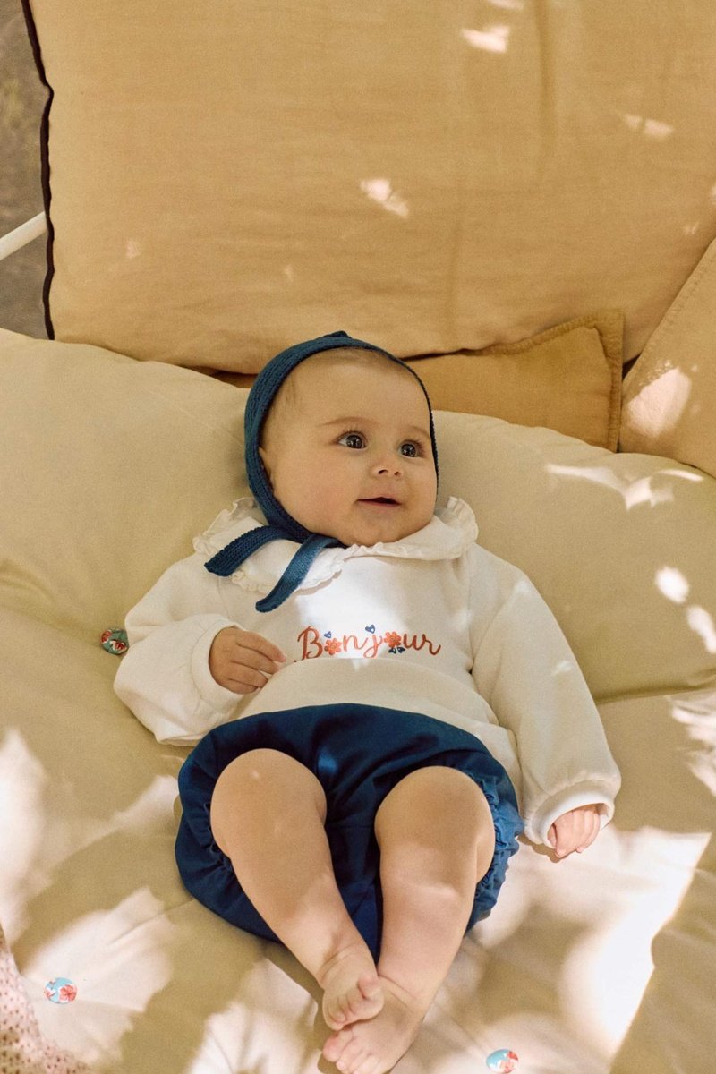 Lettrage et motifs fantaisie brodés devant.