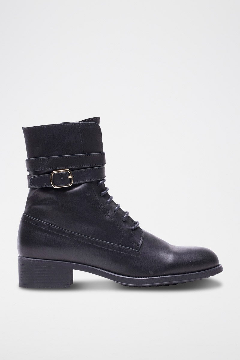Fermeture zippée sur le côté intérieur, par bride à boucle sur le côté extérieur et à lacets.