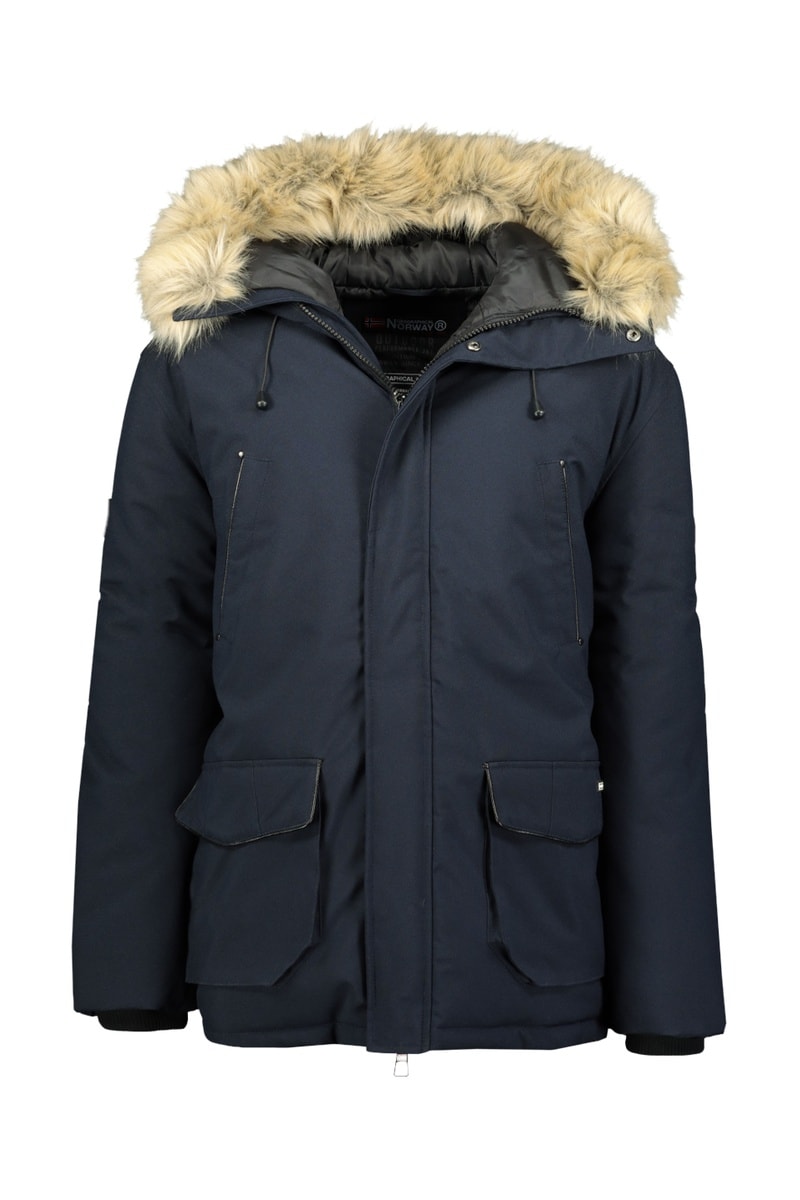 Parka à capuche avec fourrure synthétique, empiècement, liens de serrage et barillets.
