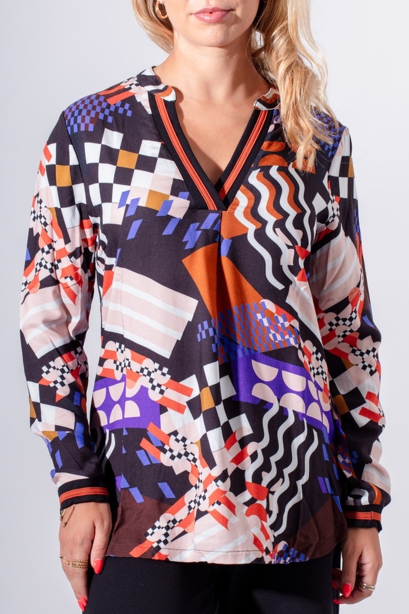 Motifs à rayures à l’encolure, sur les manches et au dos.