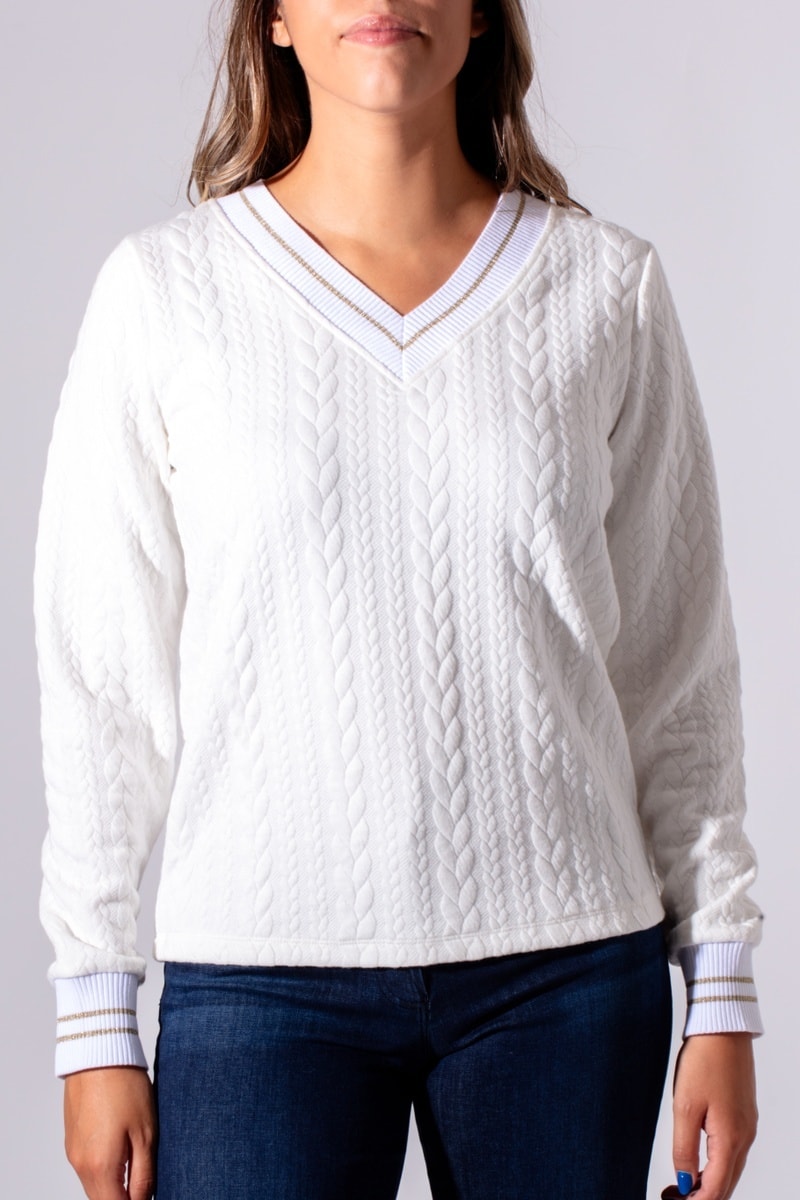 Motifs à rayures et maille côtelée à l’encolure et sur les manches.