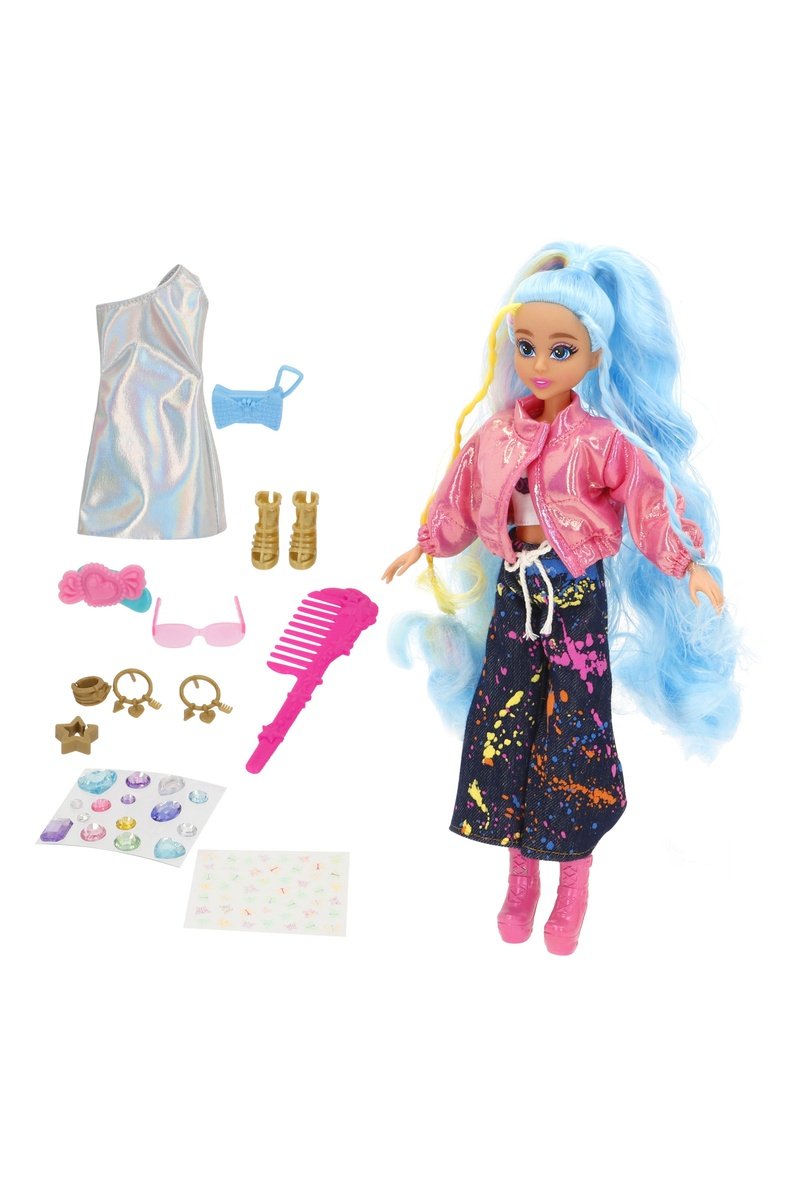 La poupée permet de créer des looks uniques grâce à ses accessoires et à sa longue chevelure bleue.