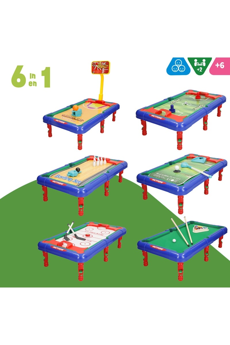 6 sports sur une table (football, basket-ball, hockey, bowling, golf et billard)