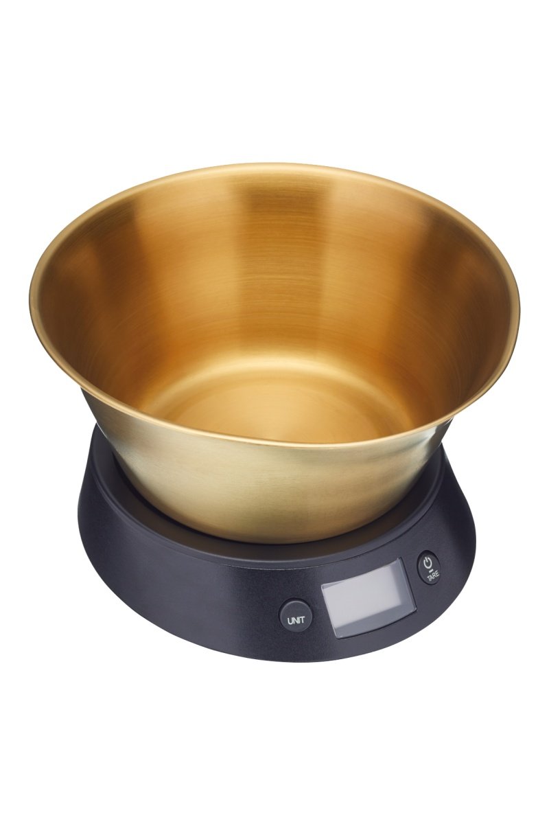 Balance de cuisine numérique avec bol en acier inoxydable effet laiton.