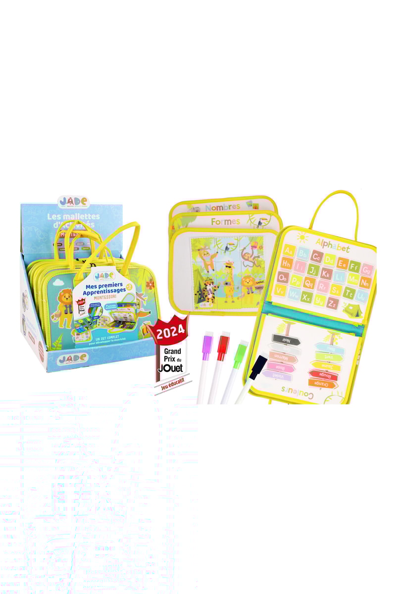 Ce jeu d'activités Montessori propose différentes planches pour apprendre les gestes du quotidien (boucles, lacets), l'alphabet, les chiffres, les couleurs, les formes, ainsi qu'un tableau blanc et un puzzle.