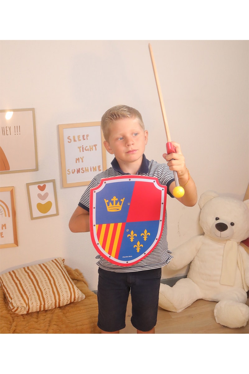Bouclier et épée en bois avec motif blason couronne, blason fleurs de lys et blason rayures.