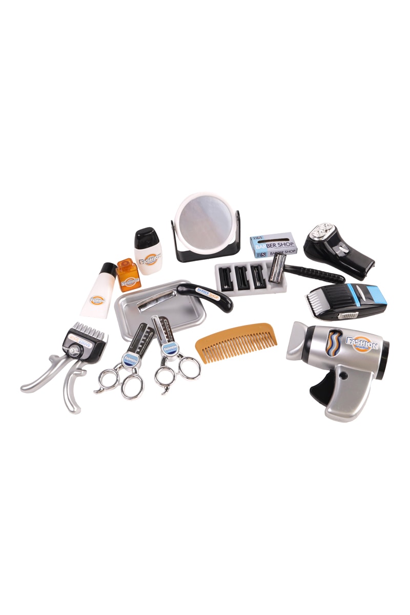 Set de barbier comprenant 1 sèche-cheveux, 2 paires de ciseaux, 2 rasoirs, 3 flacons, 1 peigne, 1 miroir, 3 tondeuses et 1 set de petits accessoires.