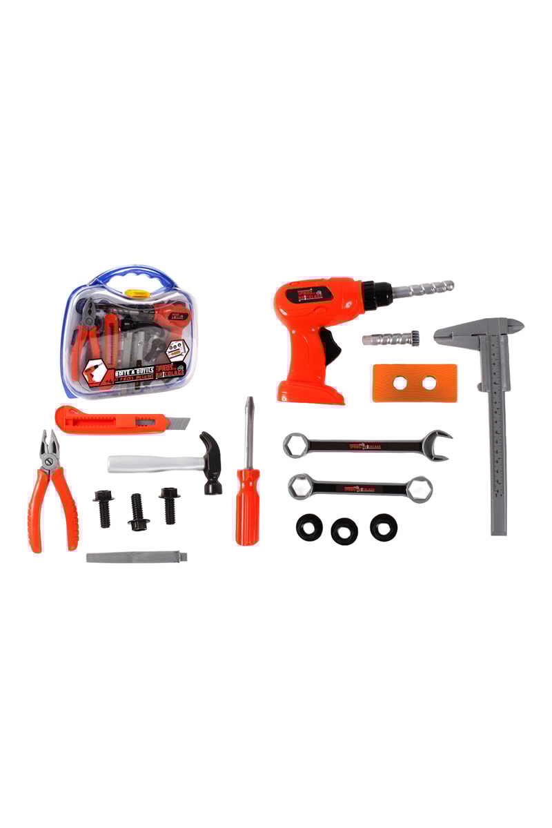 Contient 1 boite à outils (1 perceuse, 1 tournevis, 2 clés, 1 marteau, 1 pince, 1 pied à coulisse et 1 cutter, des vis et des écrous).