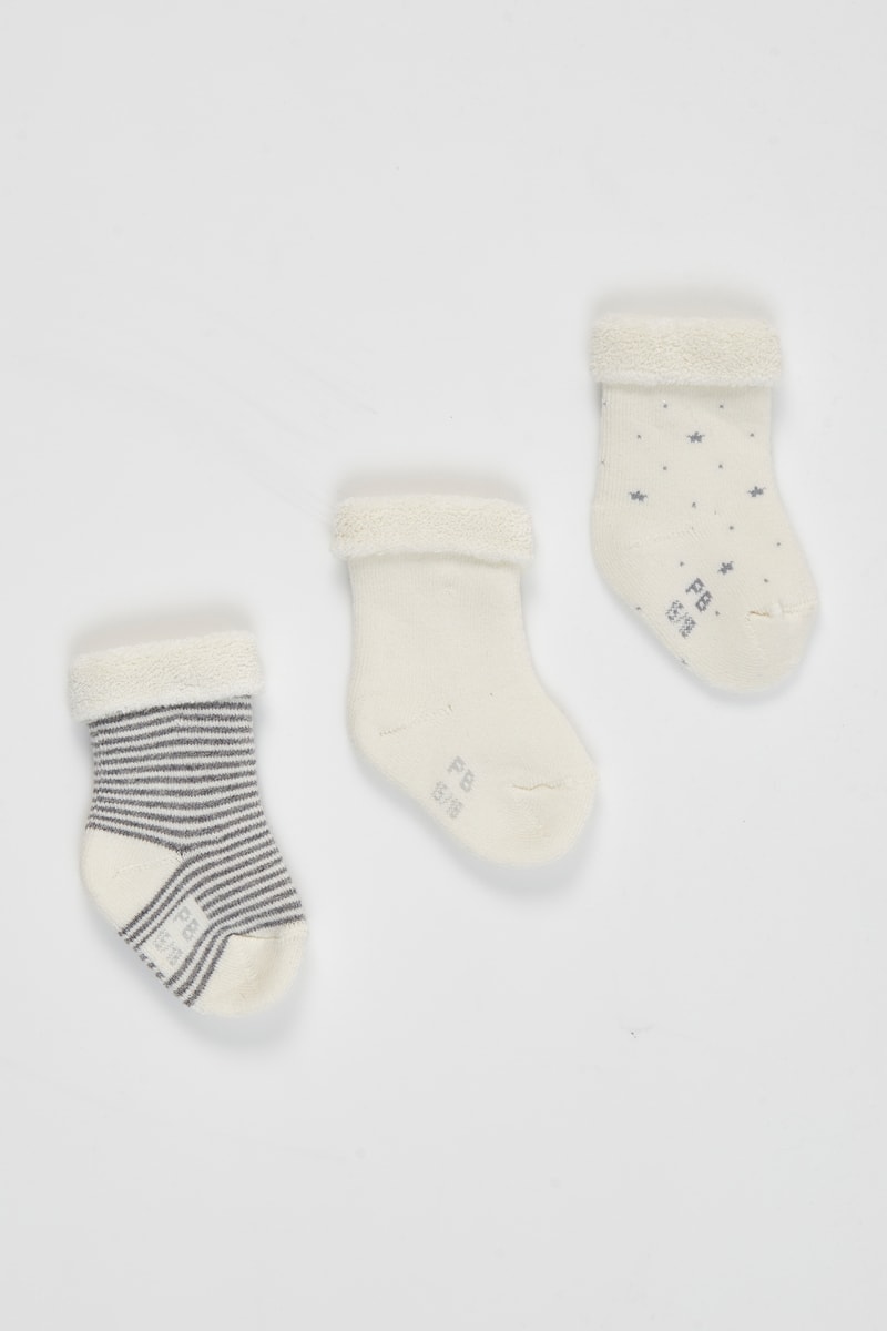 3 paires de chaussette dont 1 à motifs à rayures et 1 à motifs fantaisie.