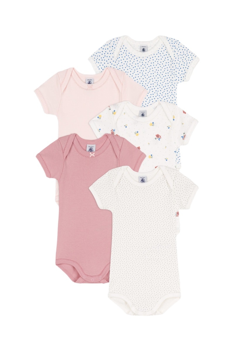 5 bodys dont 3 à motifs fantaisie et 2 avec nœud devant.