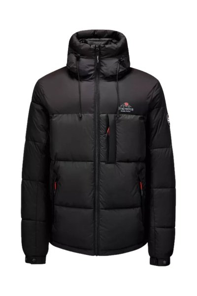 La doudoune est entièrement zippée et dotée d'un col avec capuche pour une protection contre le froid.