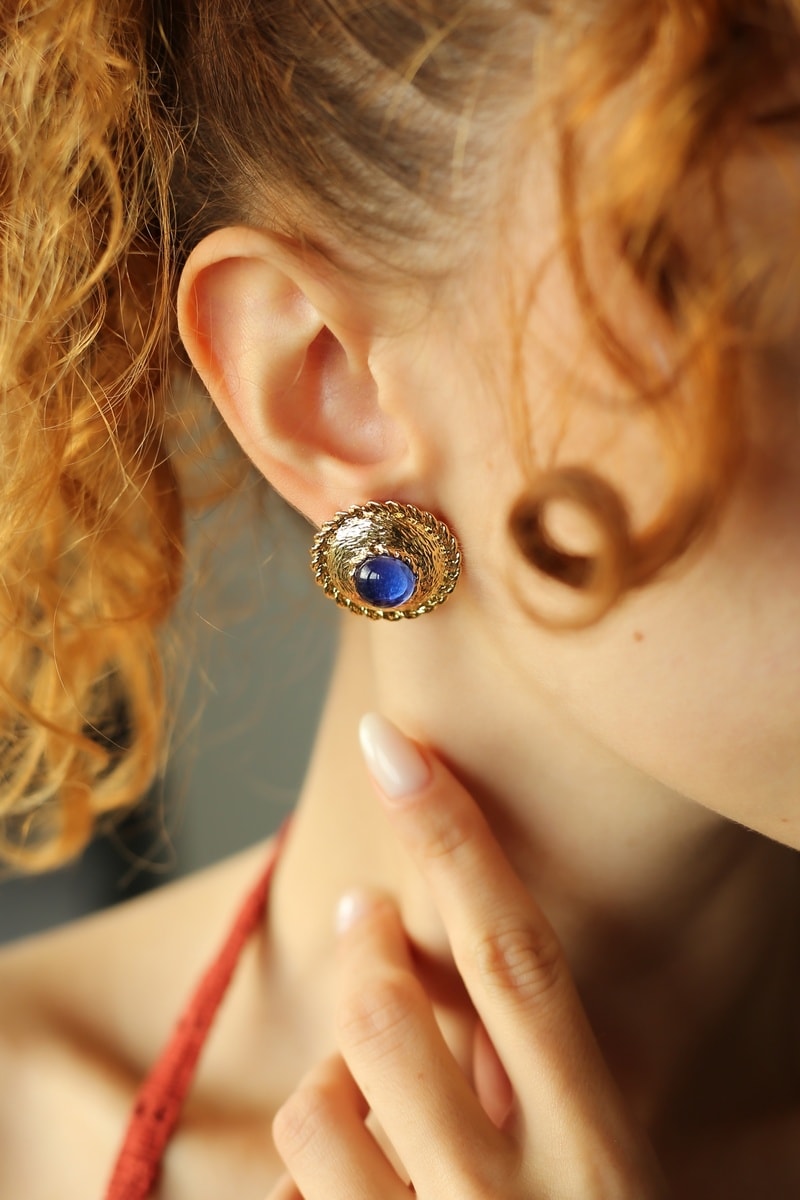 Puces en plaqué or jaune serties d'un œil-de-chat.