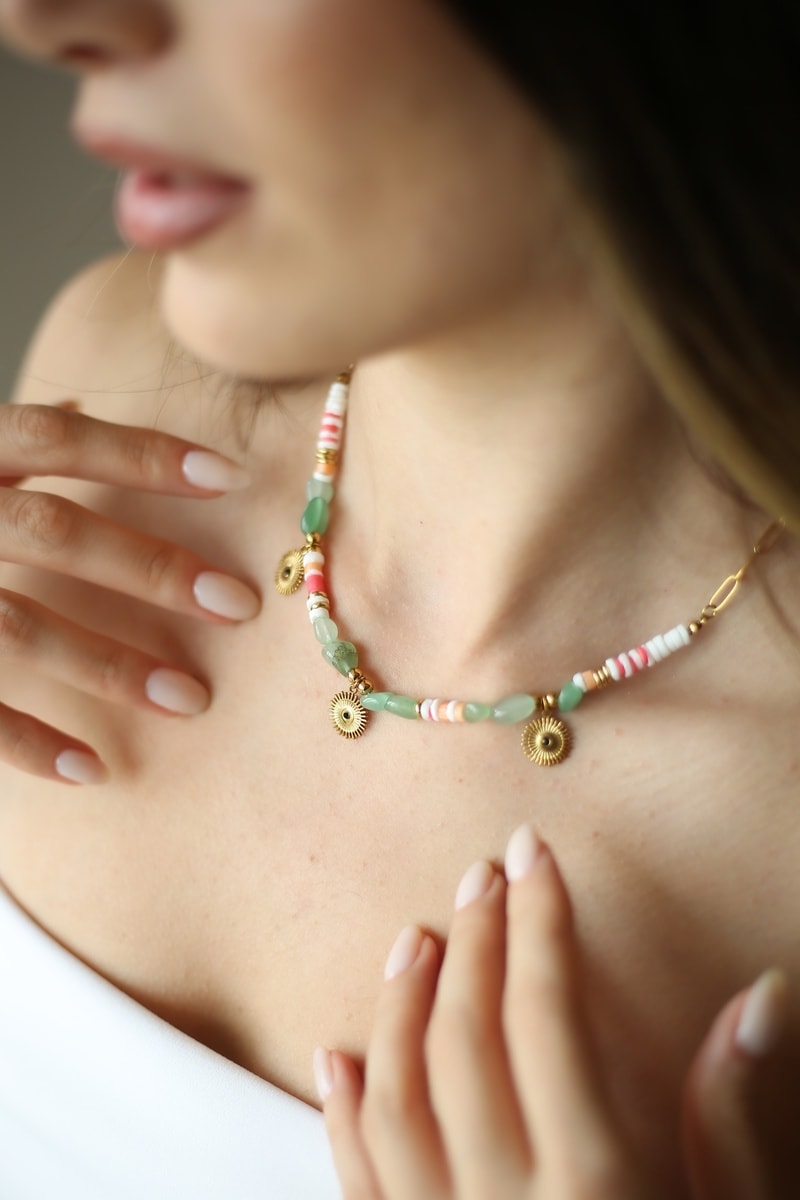 Collier - Plaqué or jaune, jaspes et aigues-marines