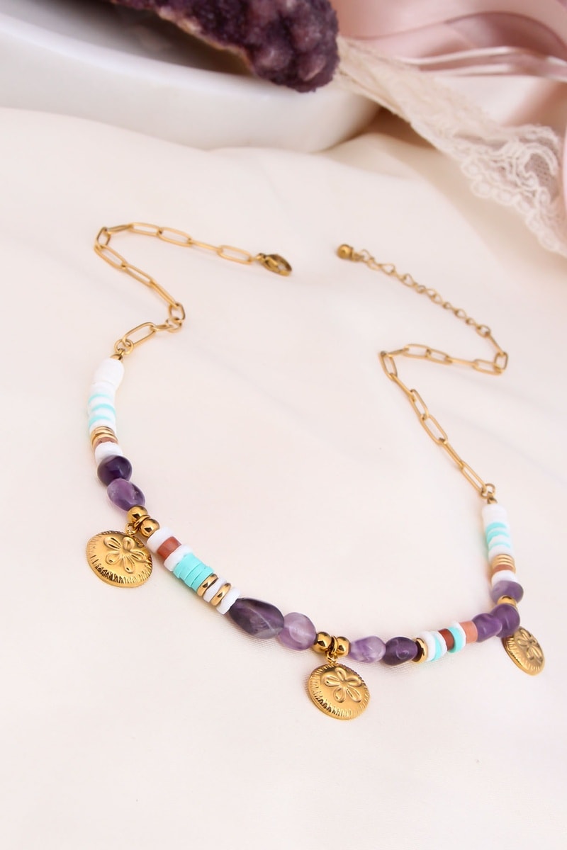 Collier en plaqué or jaune serti de jaspes et de 9 améthystes.