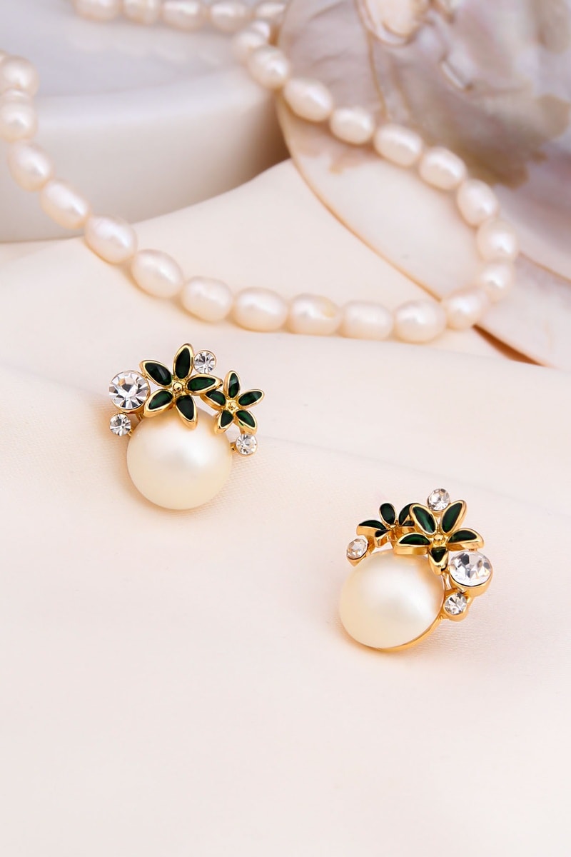 Puces en plaqué or jaune serties d’une perle de culture et de zircons.