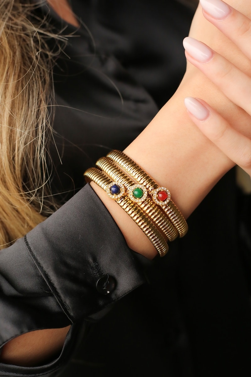 3 joncs ouverts en plaqué or jaune sertis d'un zircon.