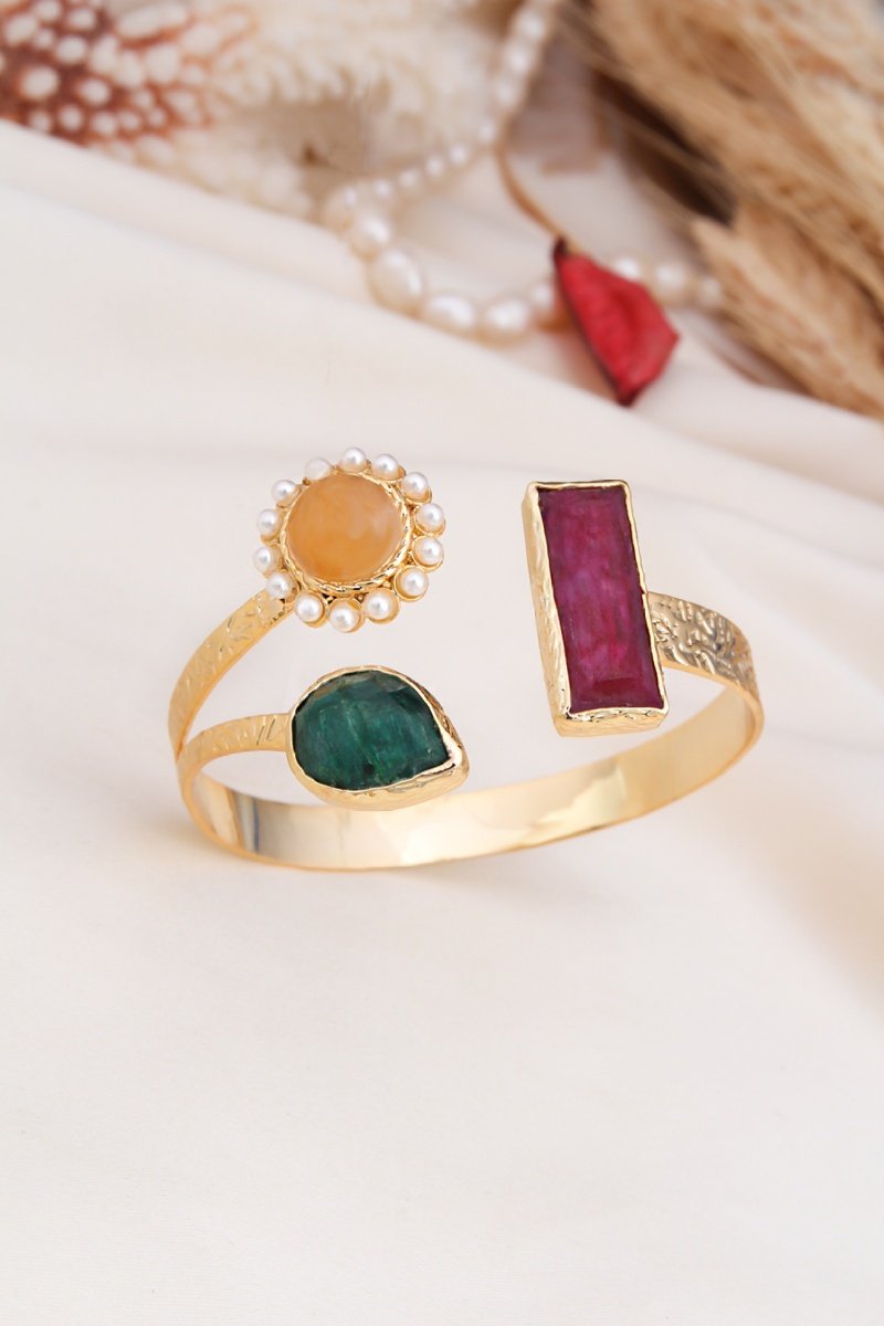 Jonc ouvert serti de 2 agates, d’une pierre de soleil et de 14 perles d’imitation.