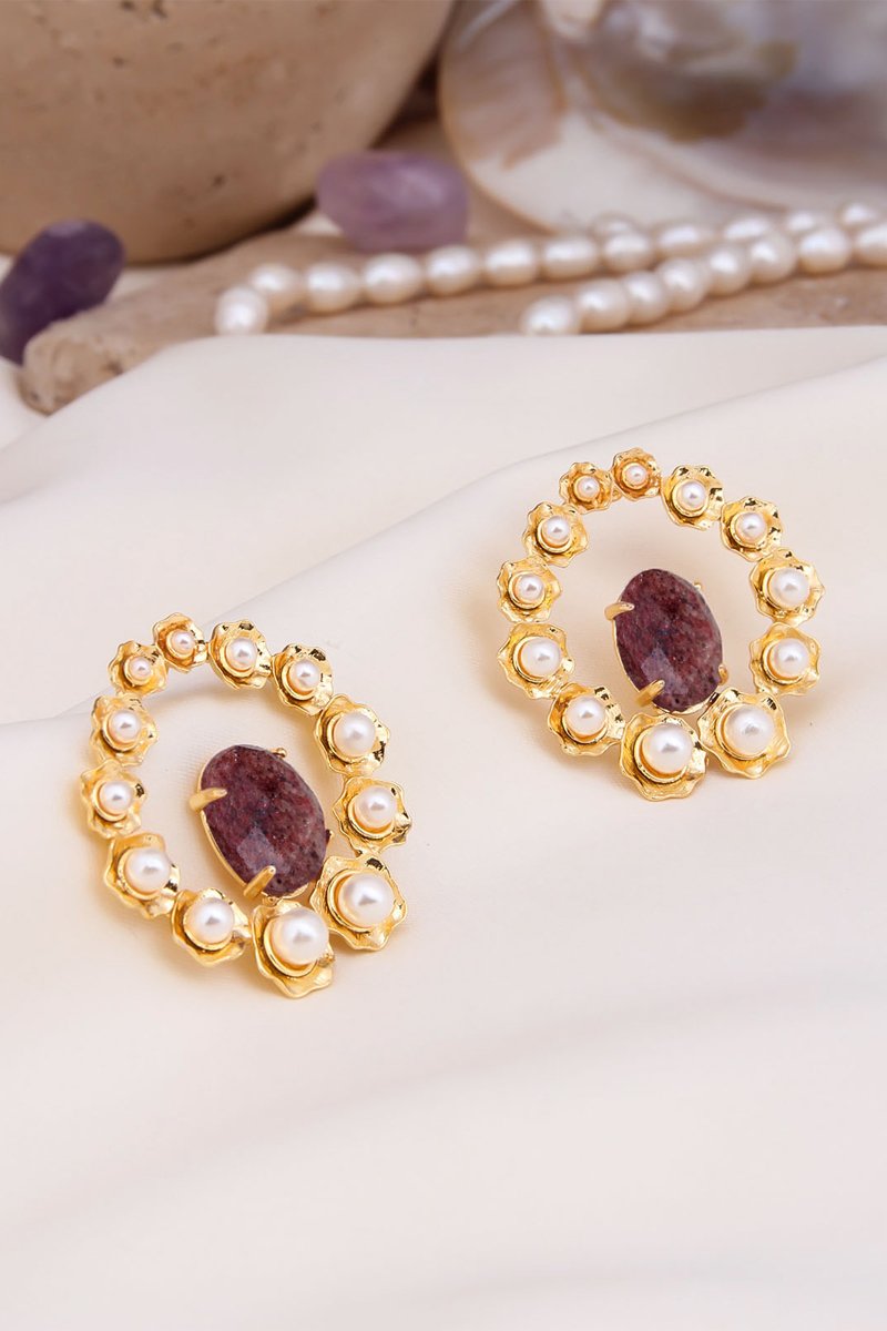 Boucles d'oreilles serties d'un quartz fraise et de perles d'imitation.