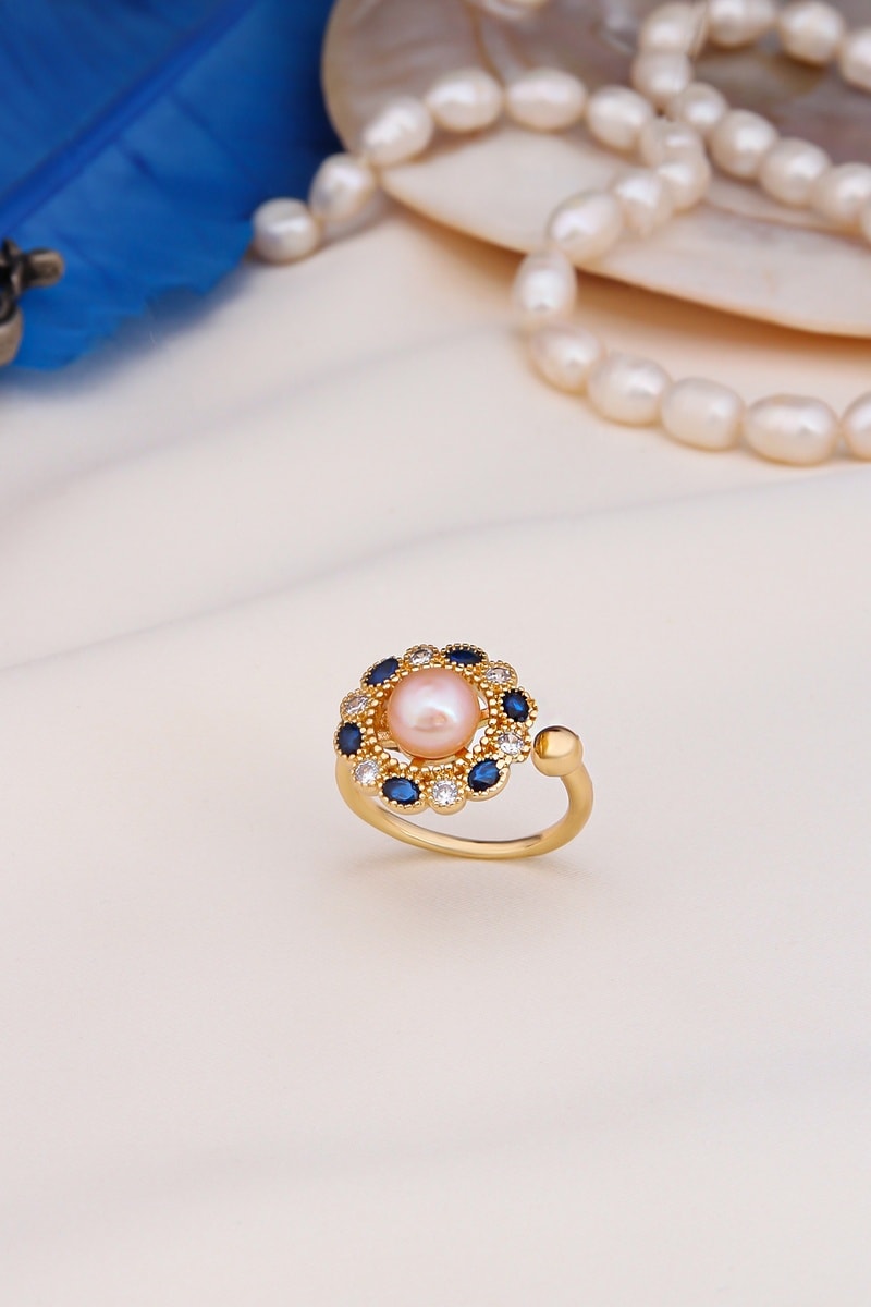 Bague réglable sertie d’une perle de culture et de 12 zircons.