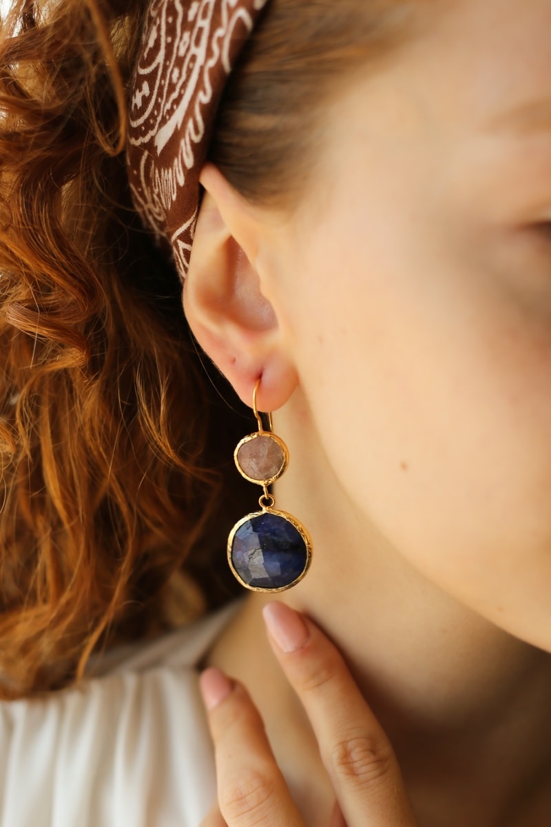 Boucles d’oreilles serties de lapis-lazuli et de pierre de soleil.