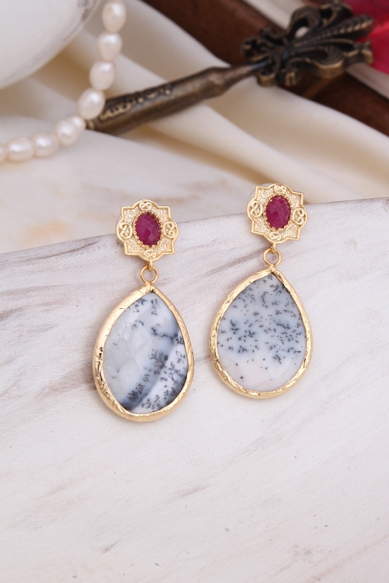 Boucles d’oreilles pendantes serties d'une opale et d’une agate.