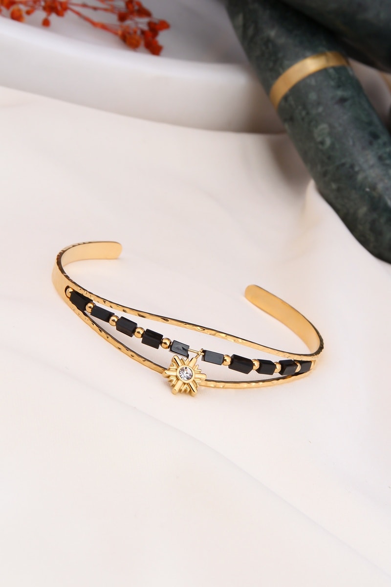Jonc ouvert en plaqué or jaune serti de 10 onyx et d’un cristaux.