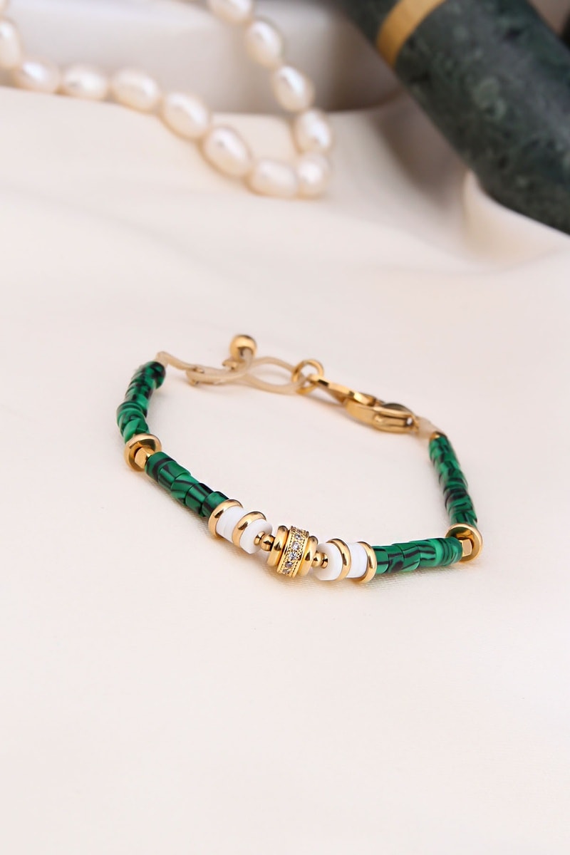Matière : acier inoxydable plaqué or jaune, malachites et cristaux