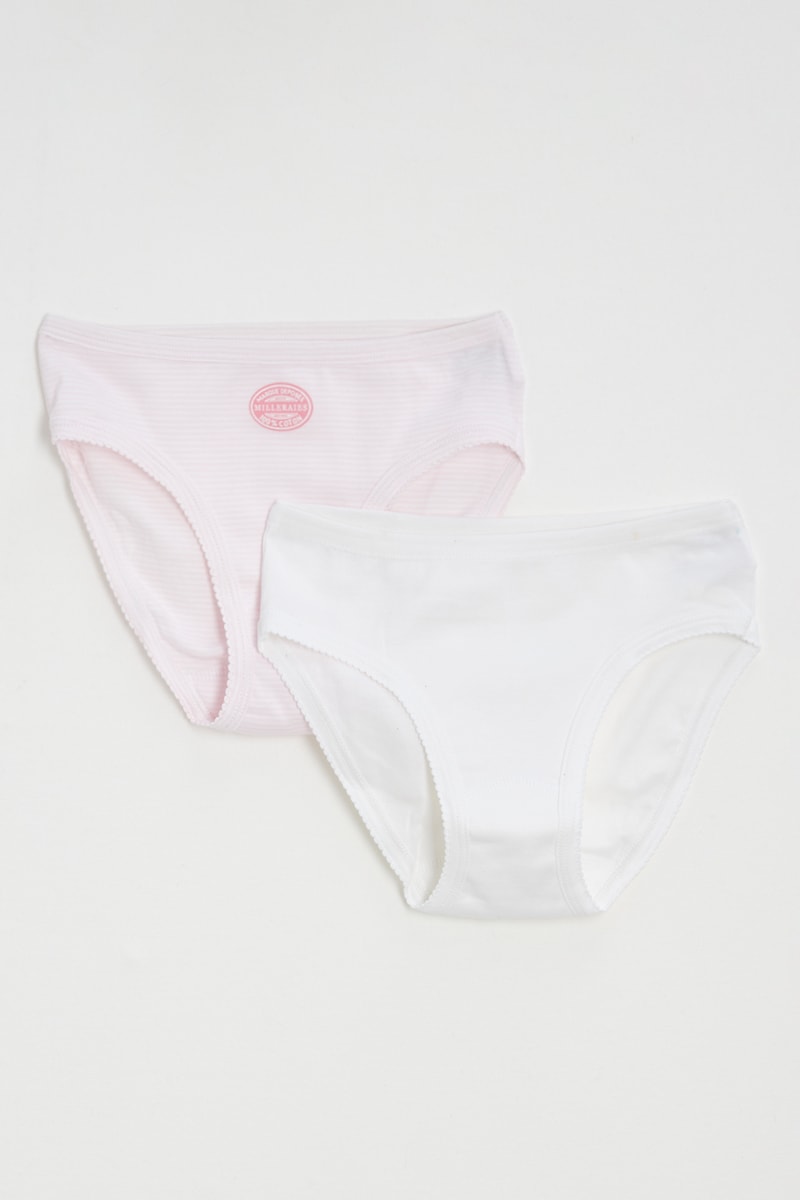 2 culottes dont 1 à motifs à rayures et avec logo devant.