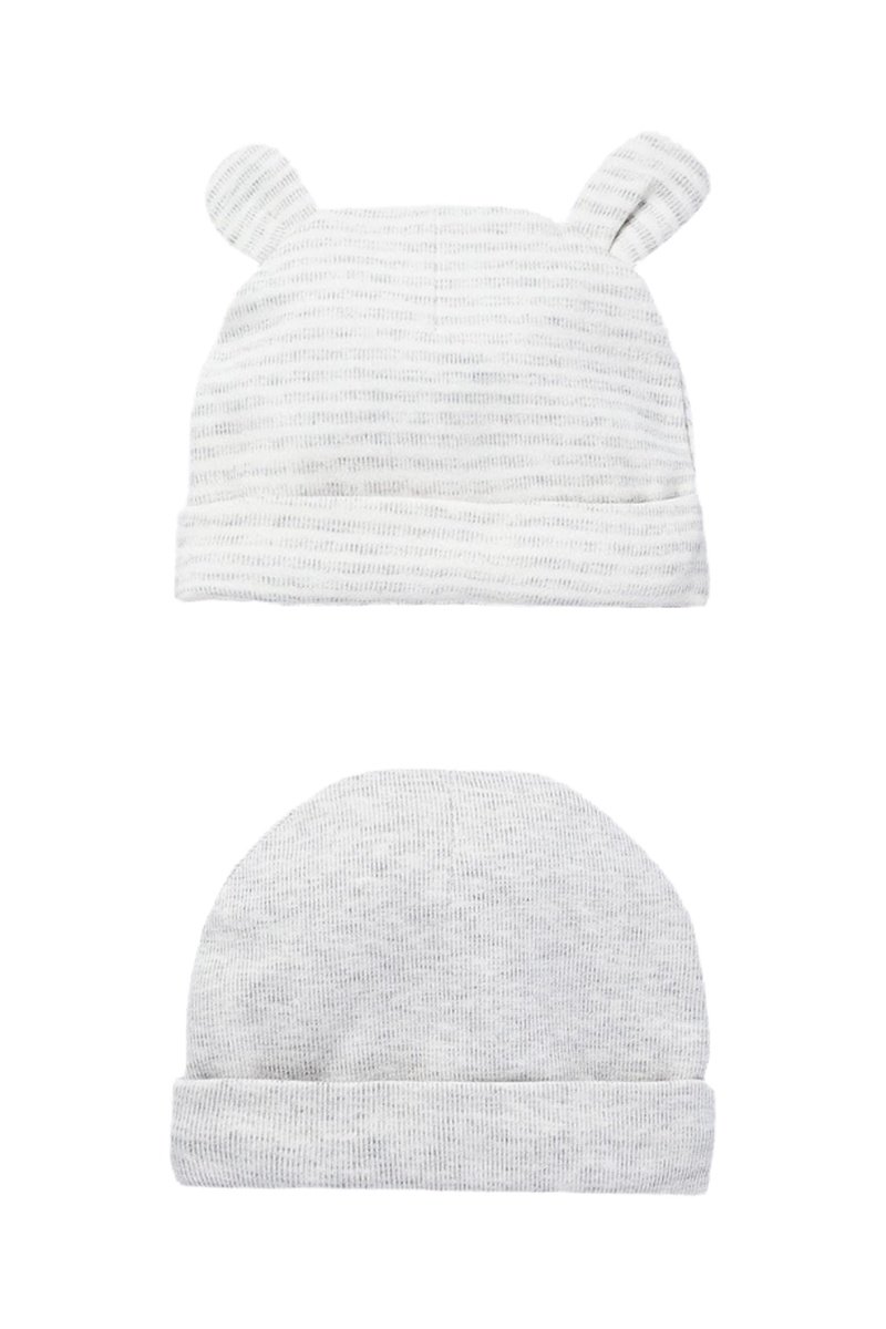 2 bonnets dont 1 à oreilles et motifs à rayures.