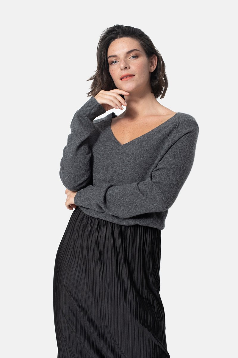 Pull Giusalet 100% cachemire, 2 fils - Col en V - Anthracite chiné