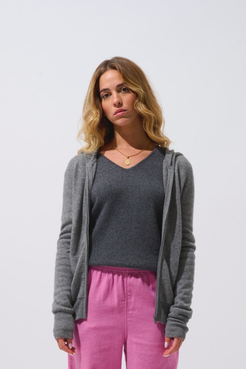 Gilet à capuche Colombis 100% cachemire, 2 fils - Gris chiné