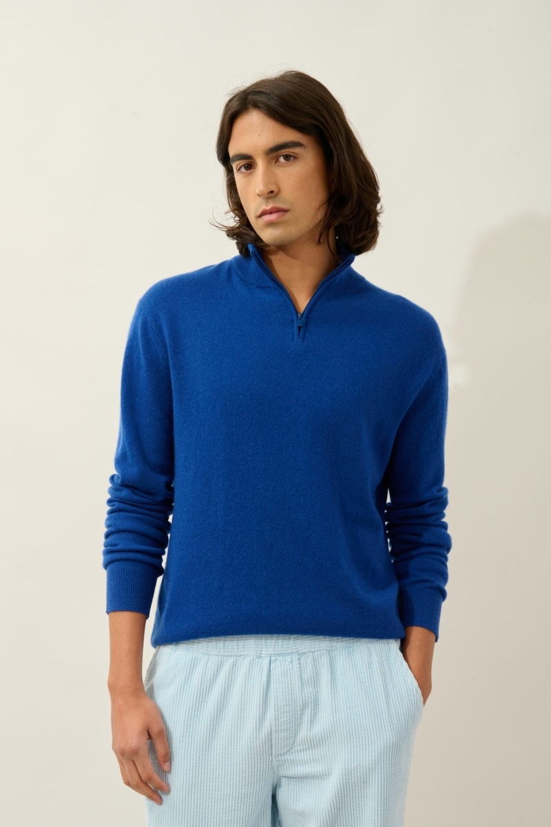 Pull Ambin 100% cachemire, 2 fils - Col montant zippé - Bleu roi