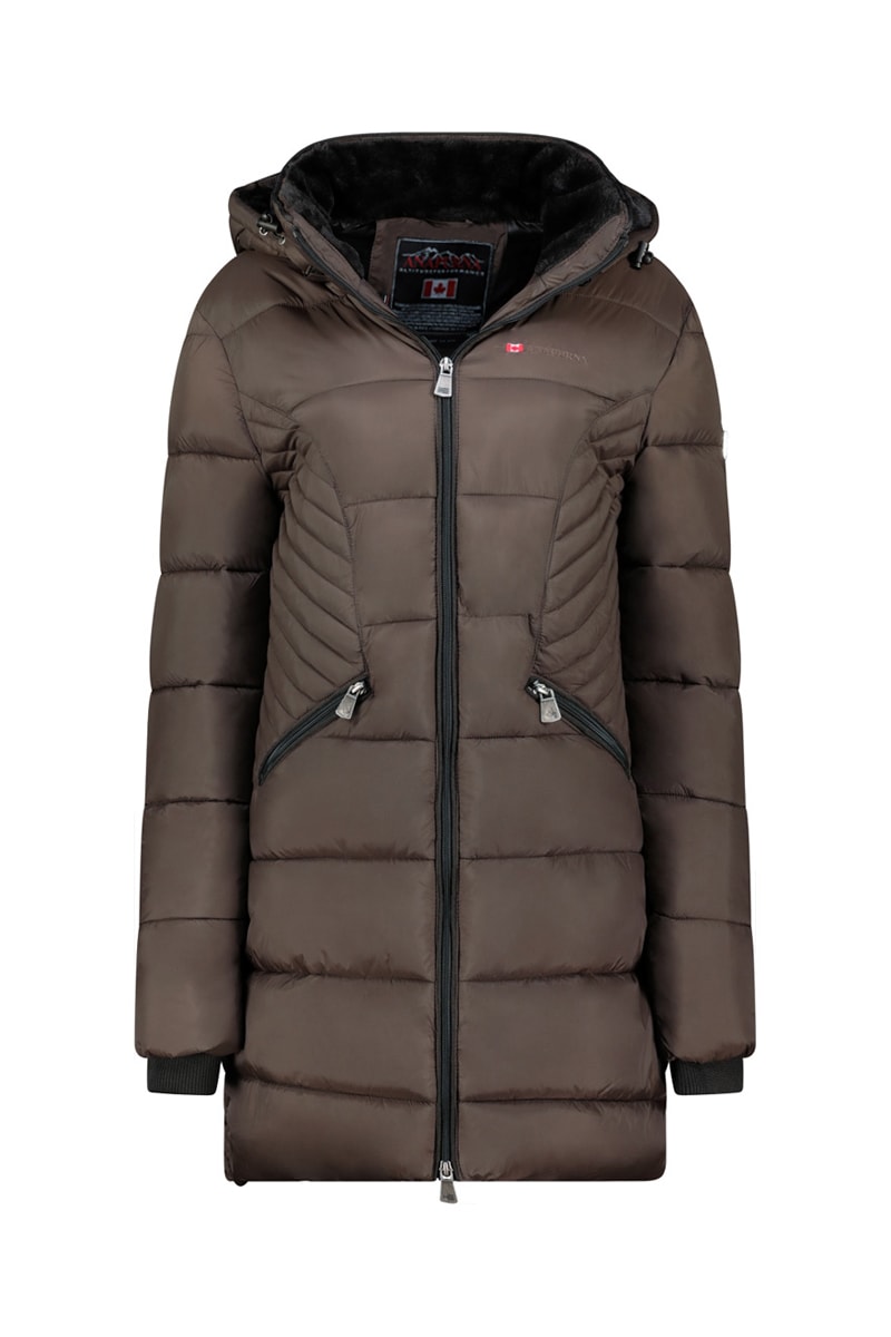 Doudoune longue à capuche amovible avec liens de serrage et barillets.