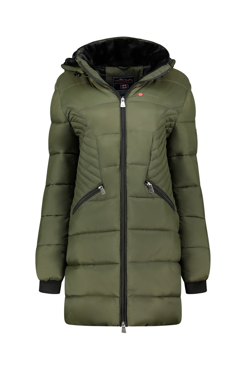 Doudoune longue à capuche amovible avec liens de serrage et barillets.