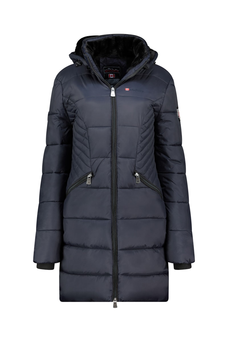 Doudoune longue à capuche amovible avec liens de serrage et barillets.